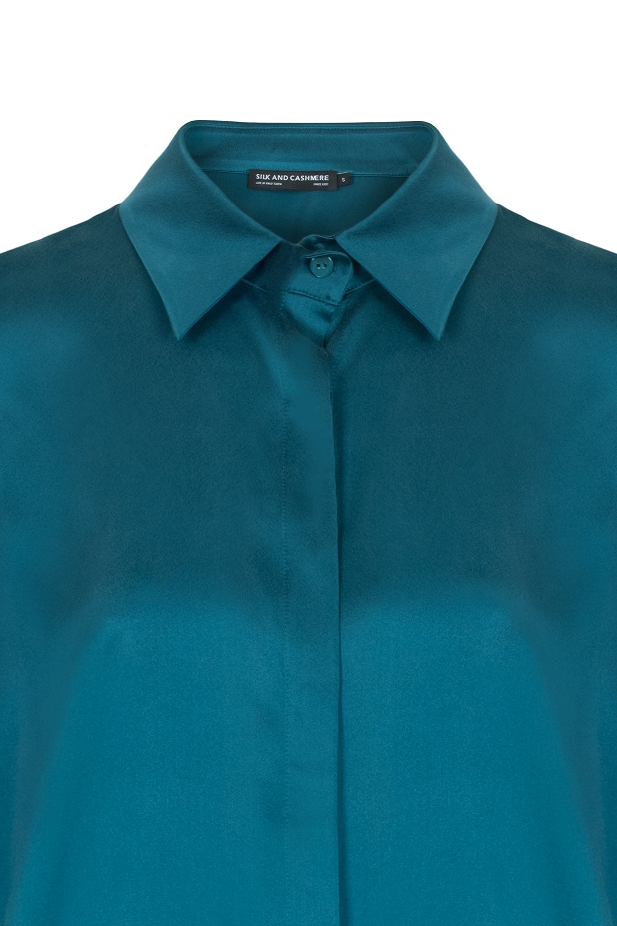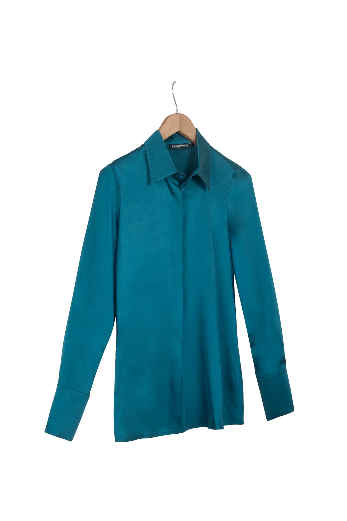 Audrey gömlek, tavuskuşunun göz alıcı tonlarını saf ipeğin doğal parlaklığıyla buluşturur. Hafif yapısı, teninize serinlik hissi sunarken, zarif detaylarıyla güçlü bir duruş sergiler. Tek başına dahi fark yaratan bu tasarım, gardırobunuzun vazgeçilmezlerinden biri olmaya aday.