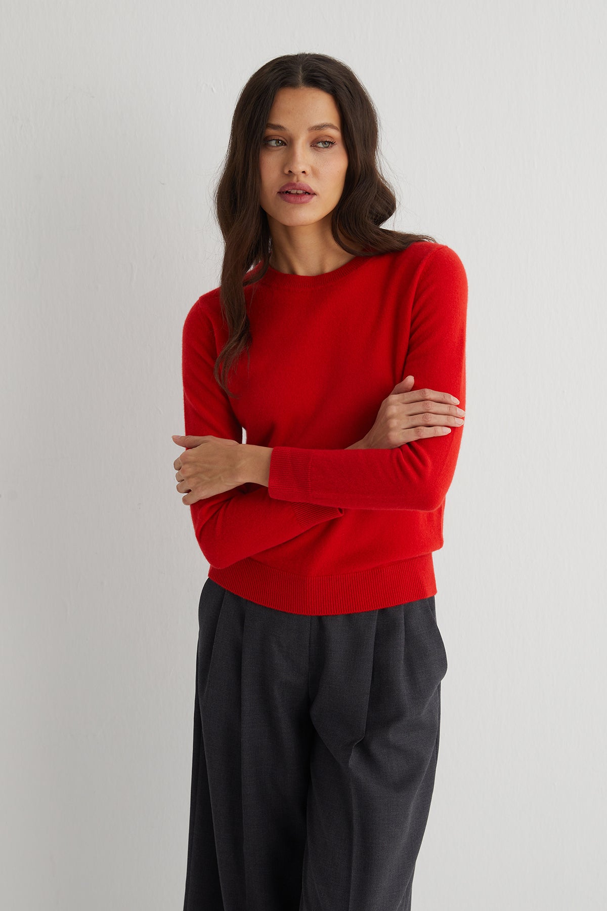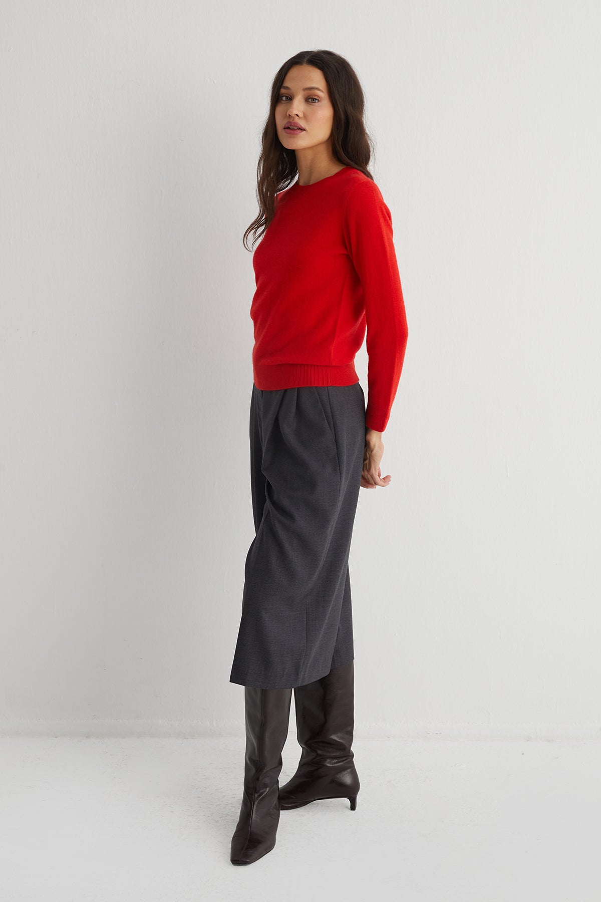 Agata kazak, turuncunun dinamik etkisini saf kaşmirin dingin dokusuyla buluşturur. Duyuları harekete geçiren bu ton, her ortamda fark edilmeyi sevenler için güçlü bir ifade alanı yaratır.