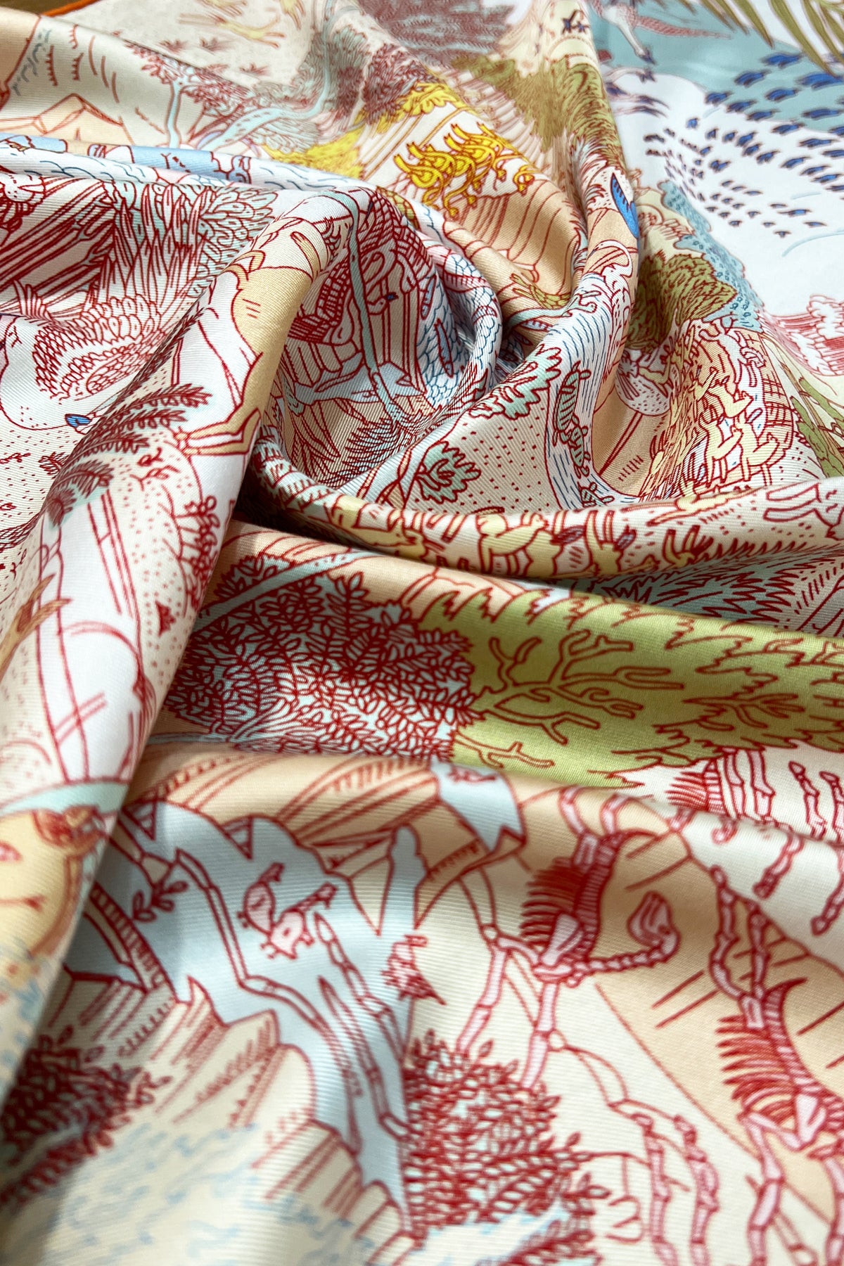 Turuncu Lena İpek Eşarp, hayvanat bahçesi temalı renkli ve capcanlı bir tasarım sunar. Bu çift taraflı eşarp, sofistike bir görünümle doğanın çeşitliliğini ve zenginliğini kutlar. Eşsiz hayvan figürleri ve doğa manzaraları ile her yüzeyi, giyim koleksiyonunuzda öne çıkan bir parça haline gelir.