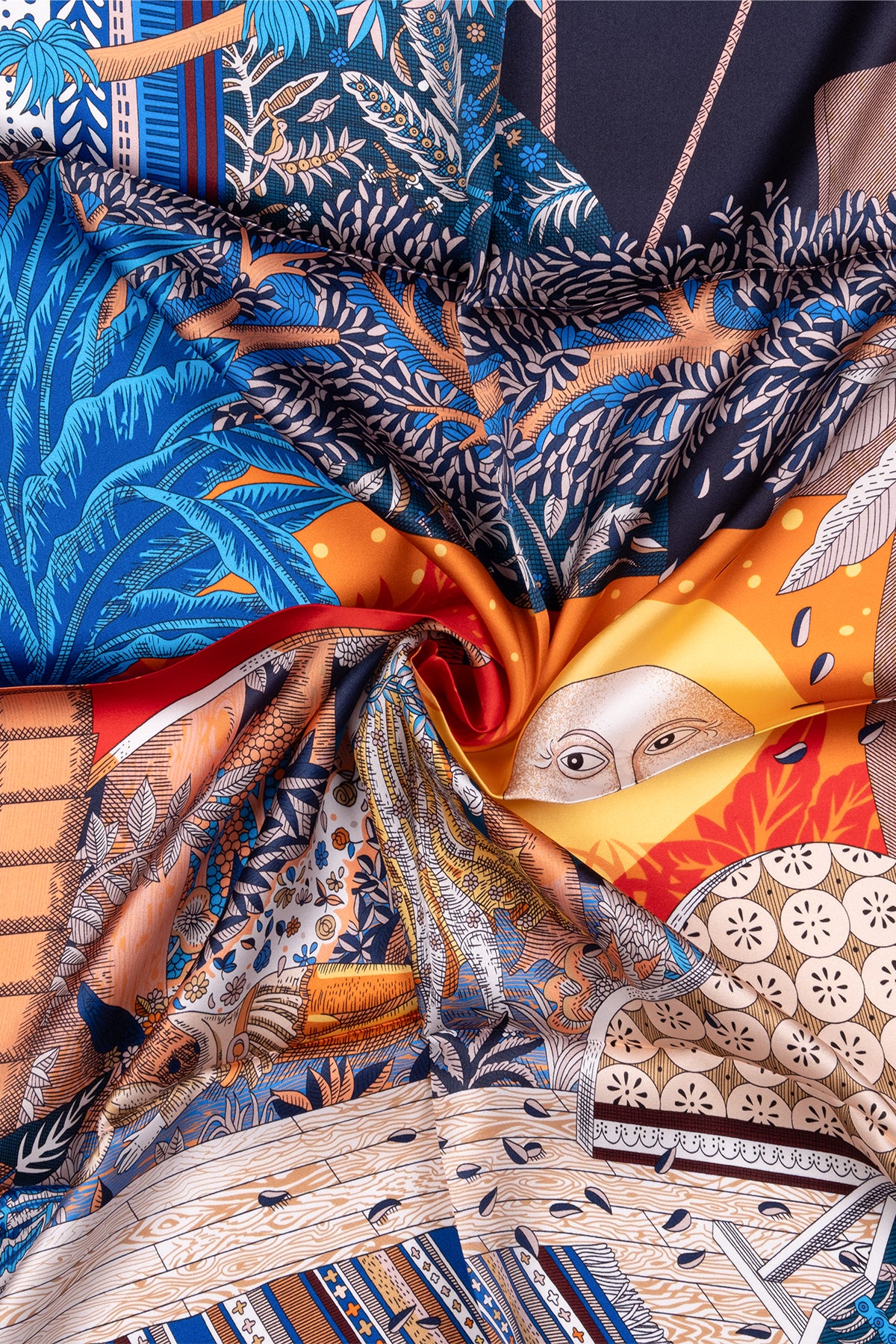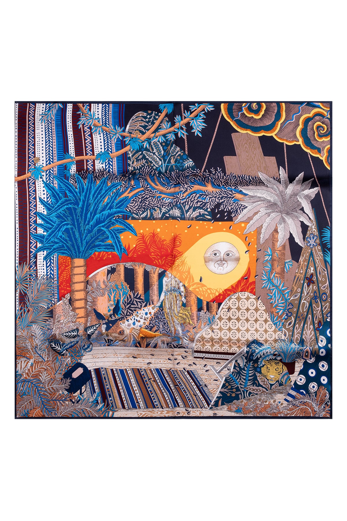 Turuncu Mavi Lara Saf İpek Desenli Kare Eşarp 90x90 cm