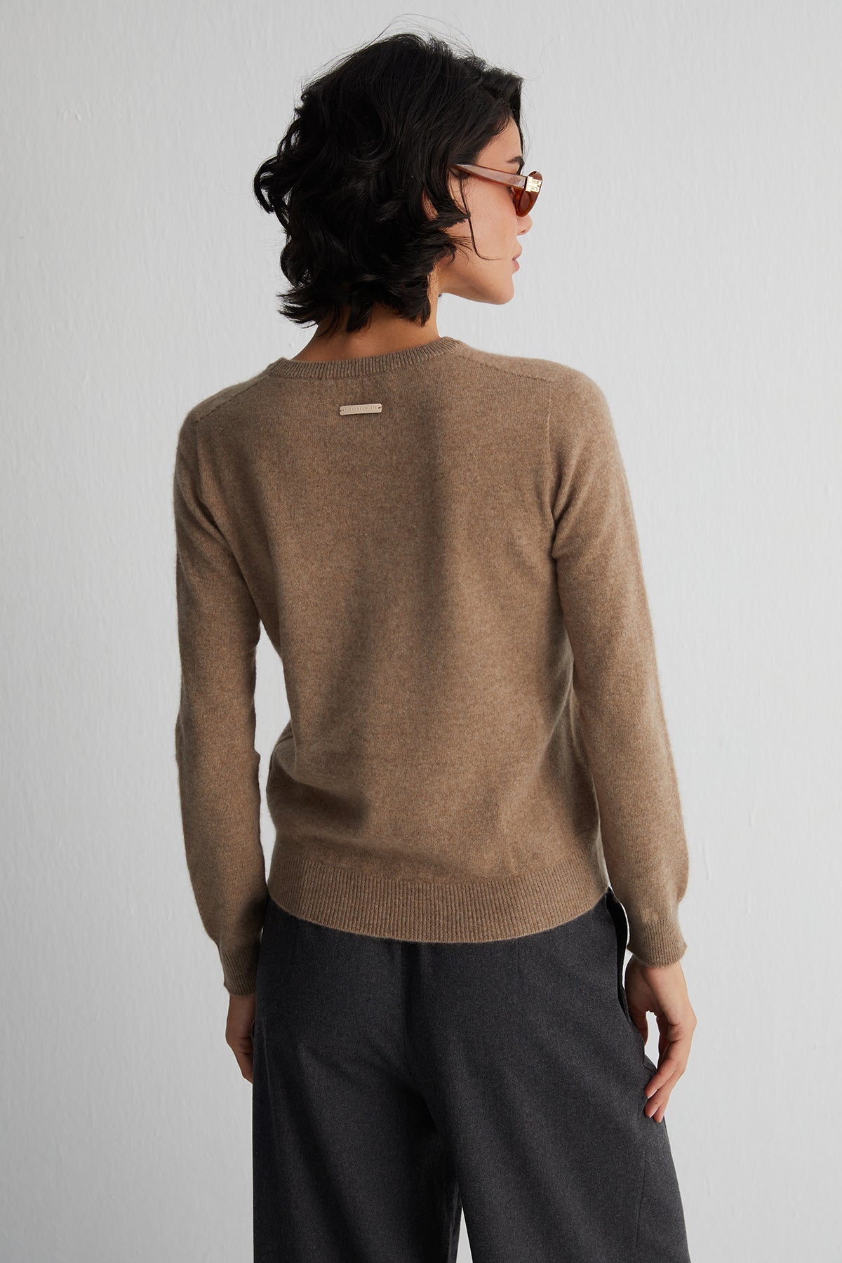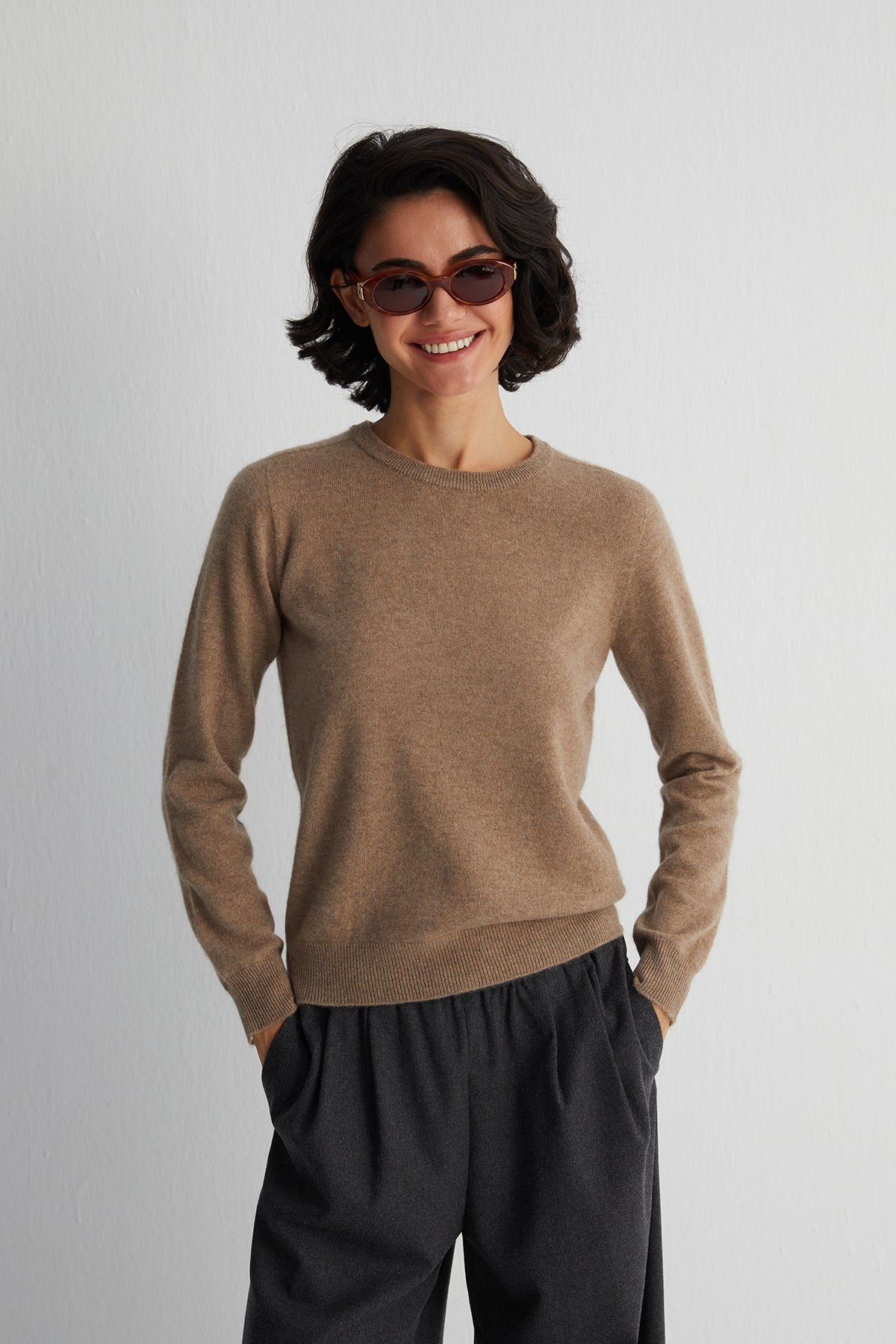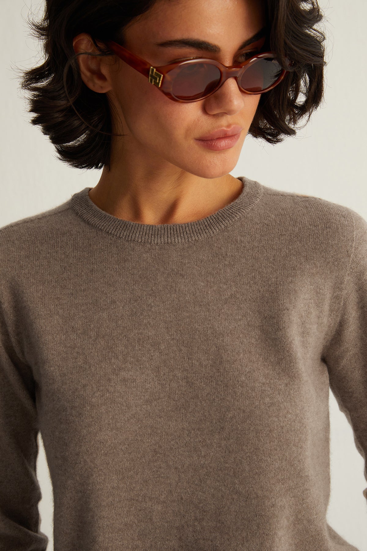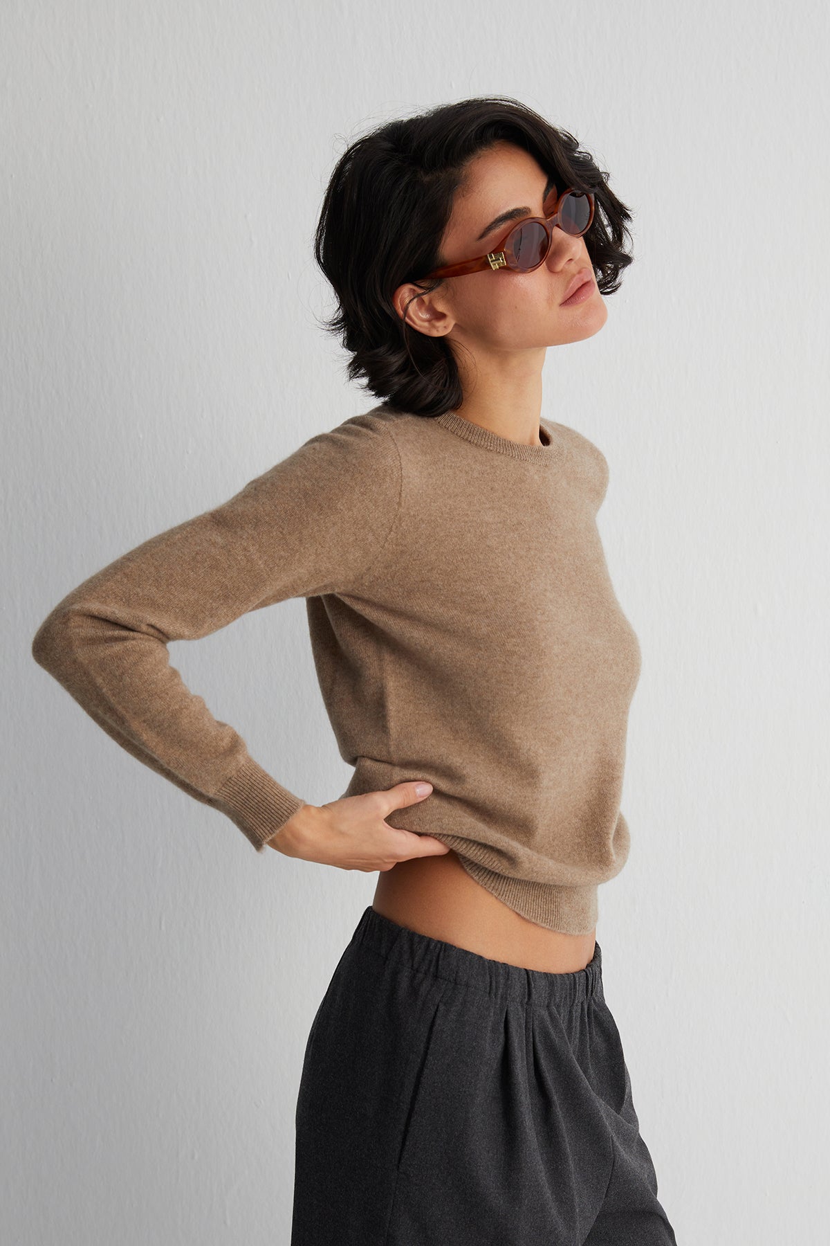 Alexia'nın saf kaşmir dokusu, vizon tonunun doğallığıyla buluşarak sade ama derin bir karakter sunuyor. Bu zarif kazak, teninizle bütünleşirken sezgisel bir konfor ve huzurlu bir his bırakır.