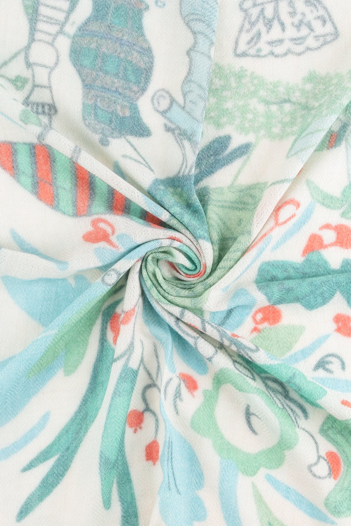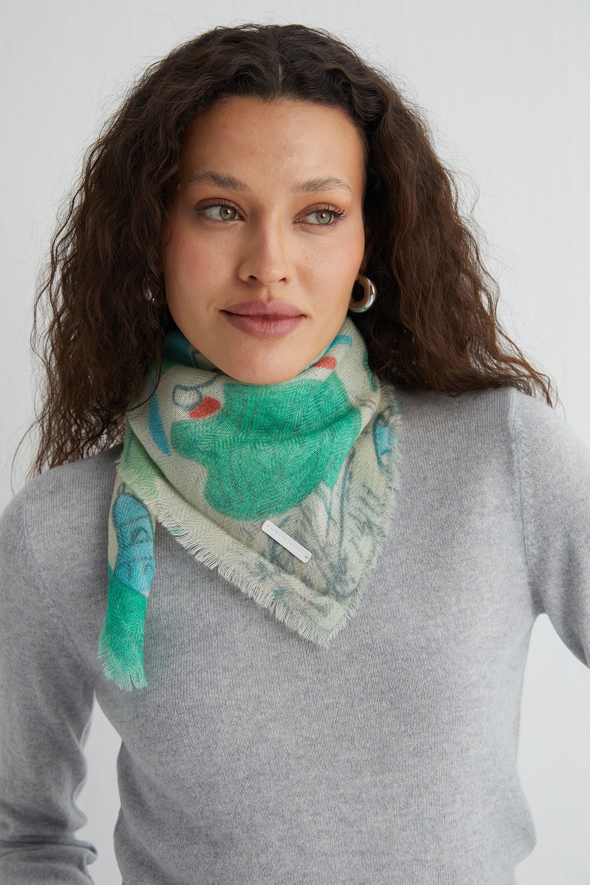 Sanatı ve doğayı iç içe geçiren desenlerle tasarlanmış bu özel kare şal, hayal gücünüzü harekete geçirirken, boynunuzda ya da çantanızda sofistike bir ifade yaratır. Yün ve kaşmirin ustalıkla harmanlandığı bu parça, dokunuşuyla hafifliğin ve sıcaklığın dengeli birlikteliğini sunar.