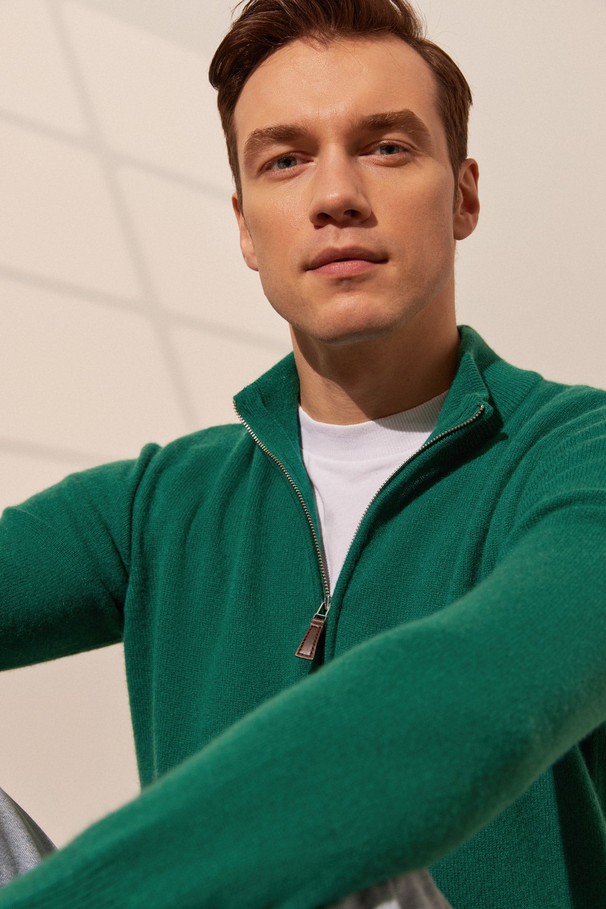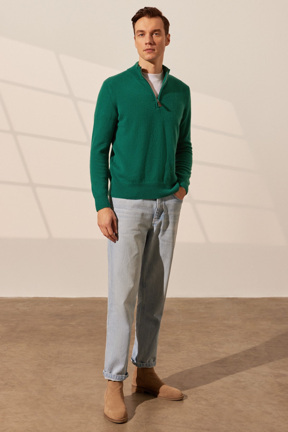 Yeşilin en asil tonu ile bezenmiş bu saf kaşmir erkek kazağı, mevsimin ruhunu ve doğanın tazeliğini stilinize yansıtıyor. Fermuar detayı ile pratik kullanım sunarken, yüksek yakası boynunuzu soğuktan korur ve zarif bir siluet oluşturur.